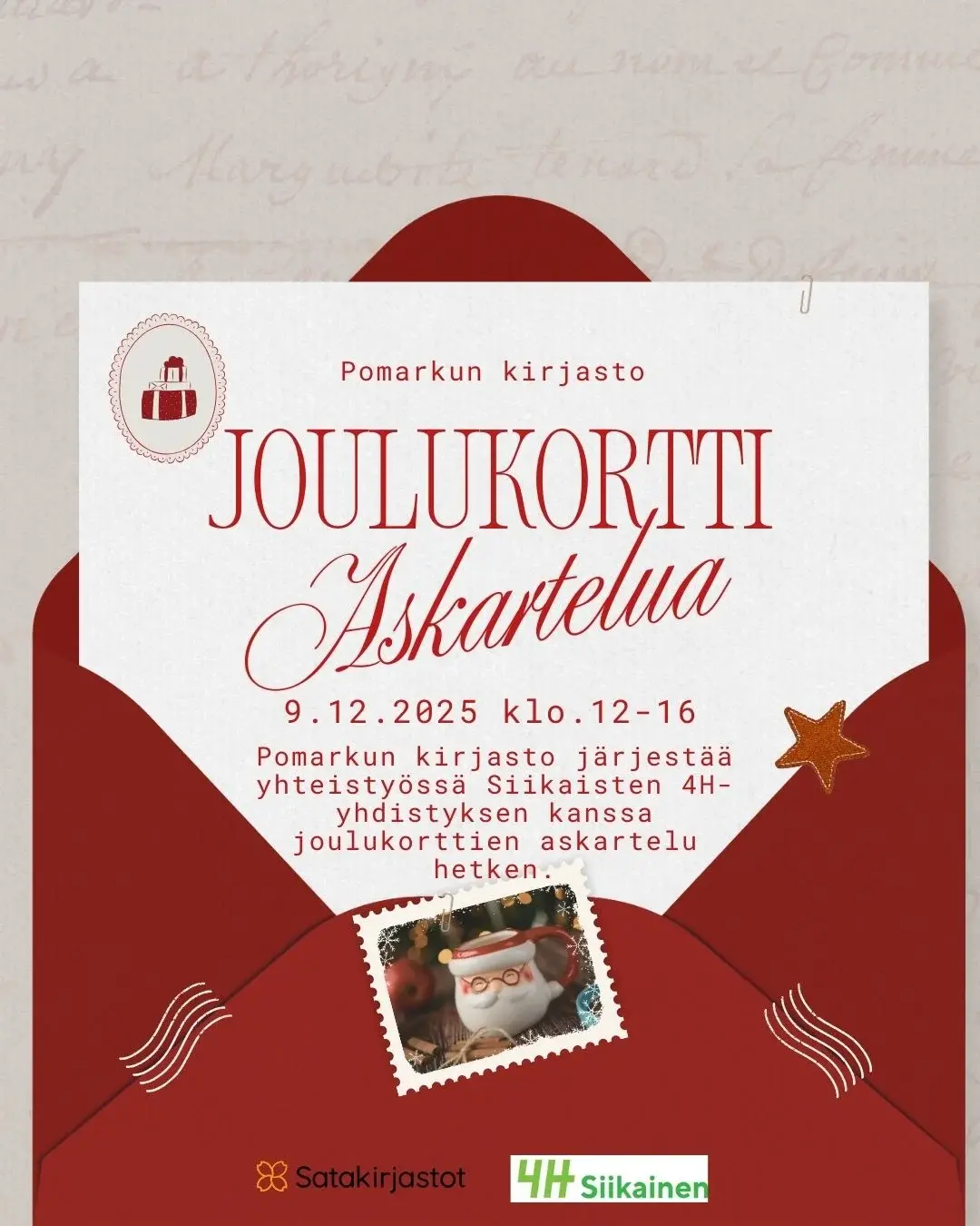 Siikaisten 4H-yhdistys ja Pomarkun kirjasto järjestävät yhteistyönä joulukorttiaskartelua. Pomarkun kirjastolla ti 9.12. klo 12-16 Tule mukaan askartelemaan perustason joulukortteja Vetäjänä: Tanja…